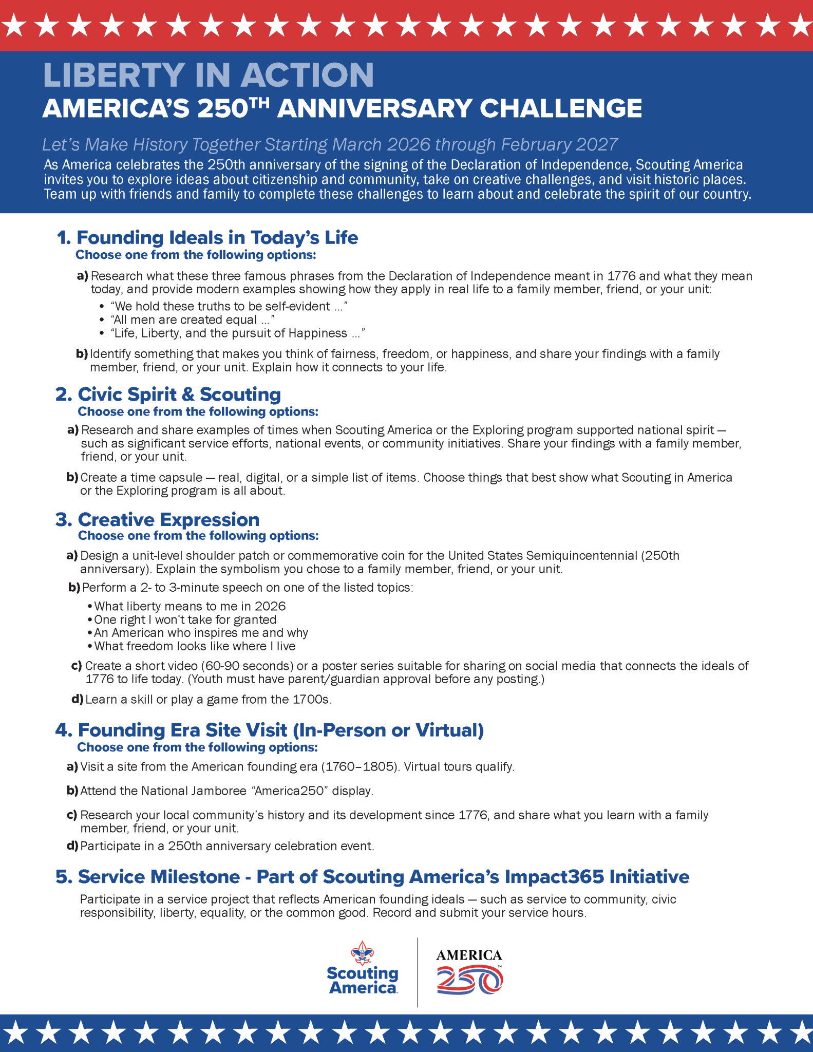 America’s 250th anniversary is more than a milestone — it’s an opportunity to reflect, learn, create, explore, and serve. The Liberty in Action: America’s 250th Anniversary Challenge invites Scouts to connect the ideals of 1776 with the responsibilities of today. Through research, civic engagement, creative expression, historical exploration, and meaningful service, participants honor the past while shaping the future!