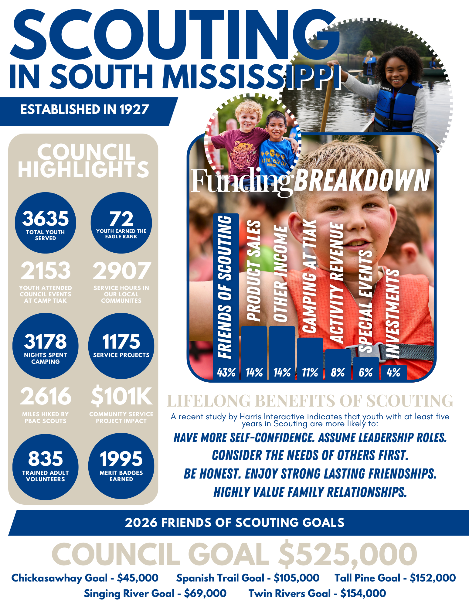 All of this is possible because of generous community support. The Friends of Scouting campaign is the largest source of funding for our Council, providing 43% of our operational income. These funds directly support: